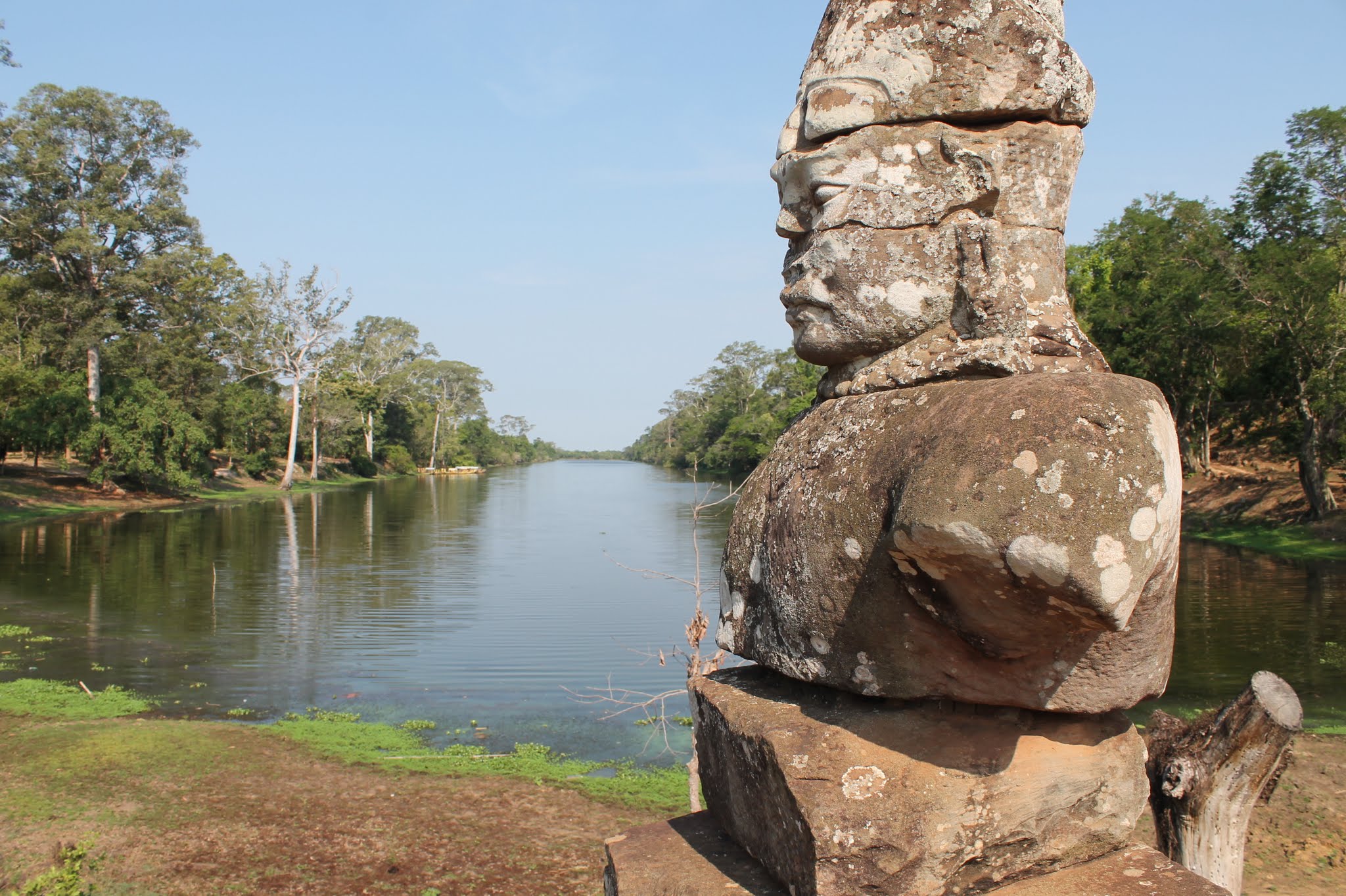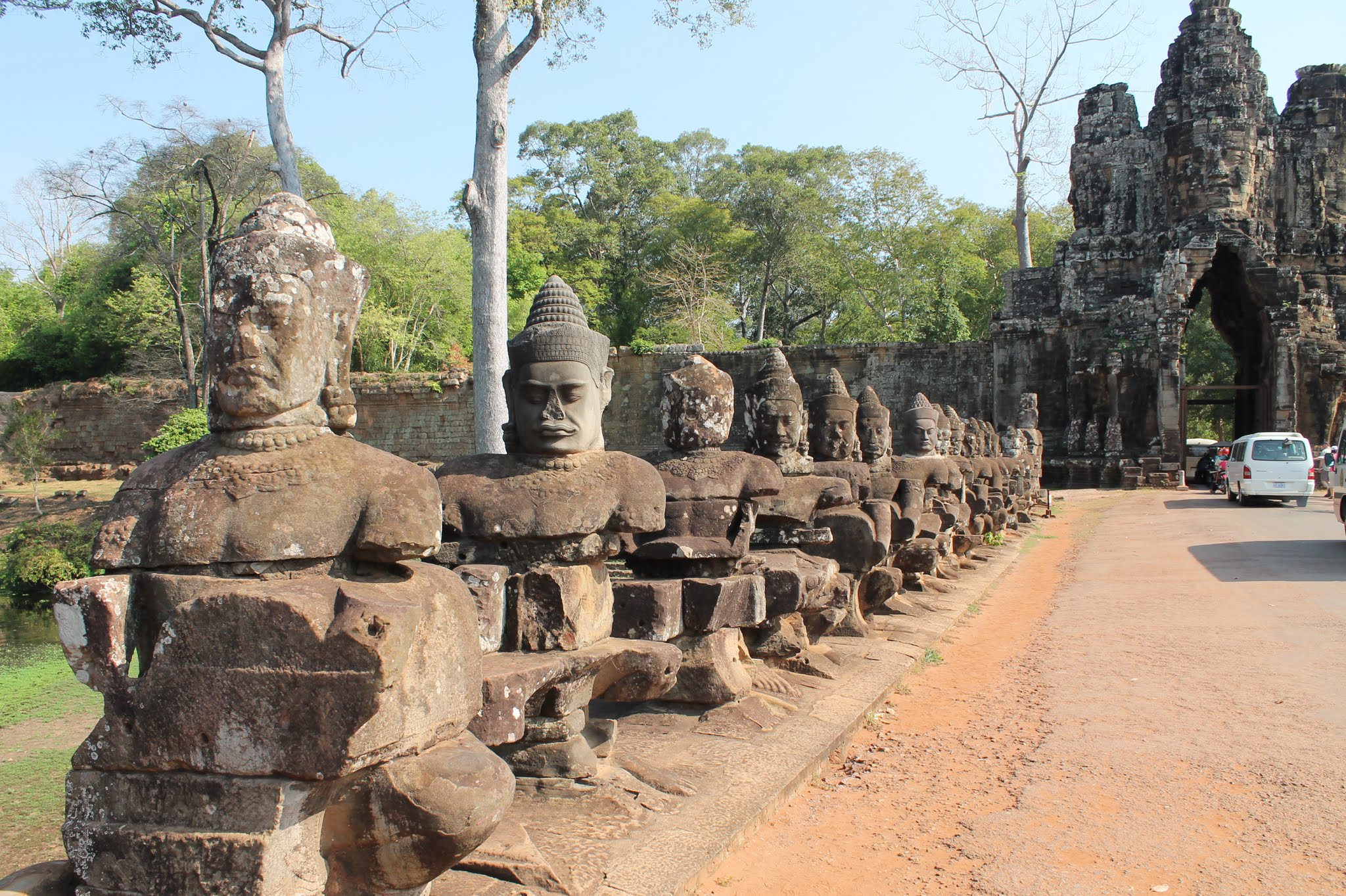 Jetzt geht es weiter zur Elefantenterrasse. Während der Busfahrt muss ich über die vielen bettelnden Kinder nachdenken. Es ist für uns unvorstellbar, dass Kinder arbeiten müssen. Aber nur so können viele kambodschanische Familien überleben. Das Wichtigste bleibt dabei vergessen – die Bildung. Wir sind am anderen Ende der Welt. Ich werde aus meinen Gedanken gerissen, denn wir sind bei der Elefantenterrasse angekommen. Auch hier vereinbaren wir wieder einen Zeitpunkt wann wir uns alle wieder zusammen finden. Unser Reiseleiter Ross ist jetzt nicht mehr so gut gelaunt. Einige Leute der Reisegruppe sind nicht auffindbar. Der arme Ross, er ist fix und alle. Aber Gott sei Dank sind wir einige Zeit später wieder vollzählig. Weiter geht es zum Preah Khan Tempel. Weil wir mit den ganzen Suchaktionen viel Zeit vergeudet haben, bleibt uns nicht mehr viel Zeit, um uns den Preah Khan Tempel anzusehen. Es ist Mittagszeit. Natürlich hat Ross ein Restaurant in petto. Wir machen an einem künstlich angelegten See halt. Das Restaurant ist auch hier wahnsinnig überteuert. So richtig Appetit haben wir auch nicht. Wir suchen uns ein anderes Lokal und trinken nur etwas. Um das kleine Restaurant stehen Mangobäume, die voll mit Früchten hängen.